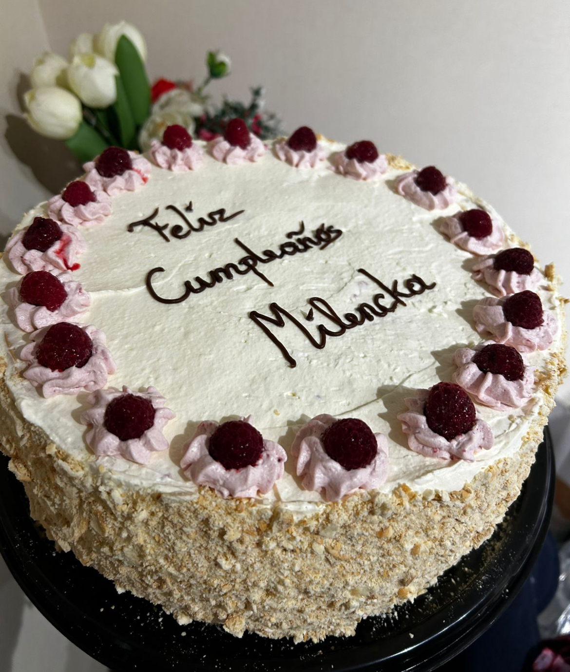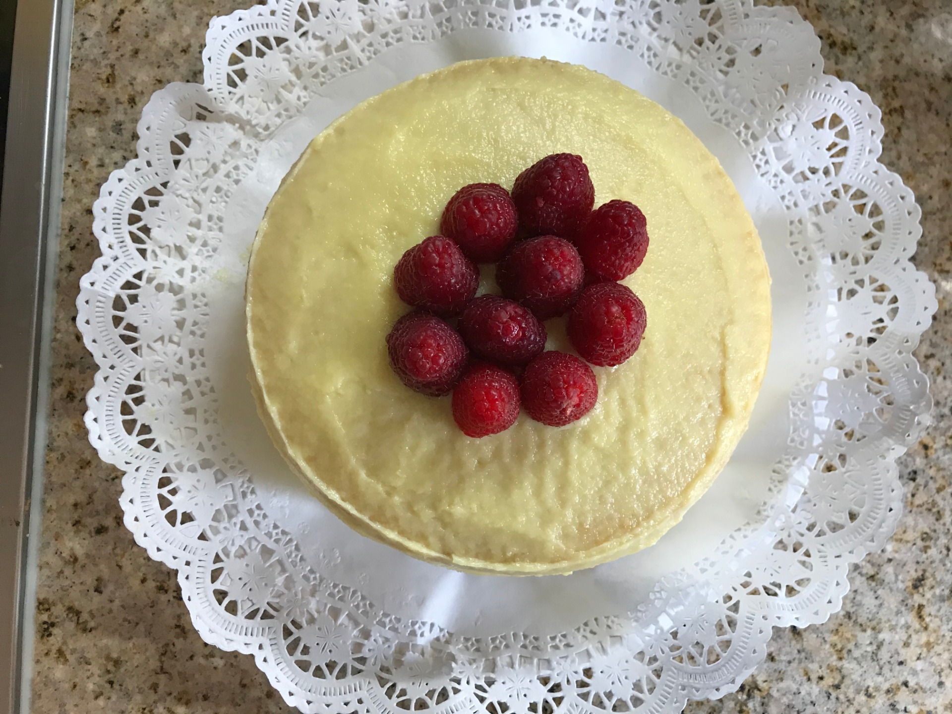 Exquisita torta de bizcocho de vainilla con un doble relleno de frambuesas frescas y crema pastelera. Una delicia para todos los amantes de la vainilla con un toque de acidez.